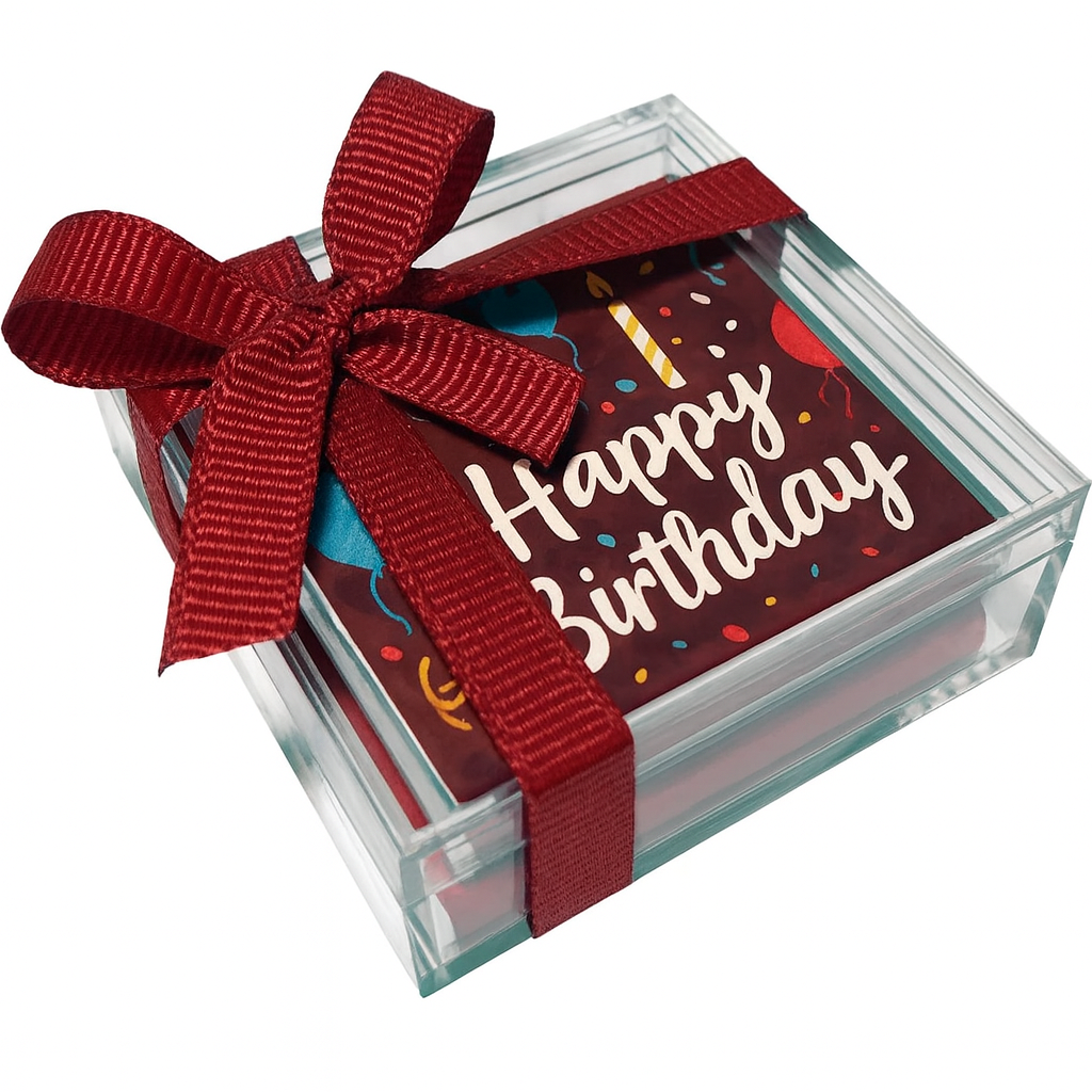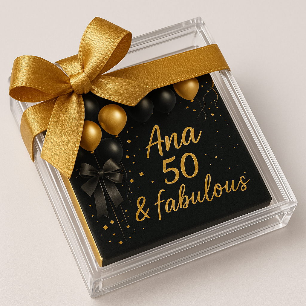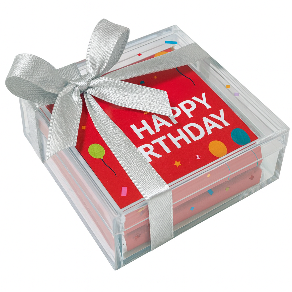 This mini acrylic box is the perfect keepsake for party favors.  Display your best photo or artwork in the custom-printed paper wrapping your chocolate square assortment.   Each box offers a mix of top quality creamy milk and rich dark Belgium chocolates (2 in each box).  The clear acrylic box can be used as a pill holder or jewelry box after you’ve enjoyed your two delicious treats. This sleek presentation is wrapped with a delicate satin ribbon making it extra special. The boxes are available in a variety of colors.